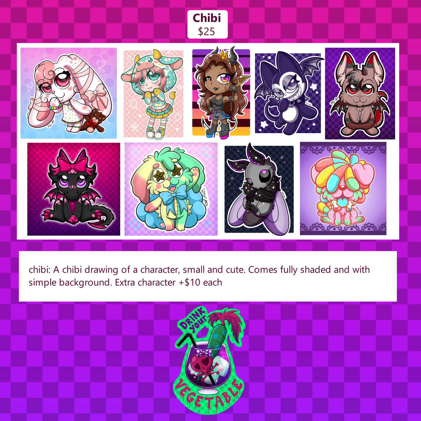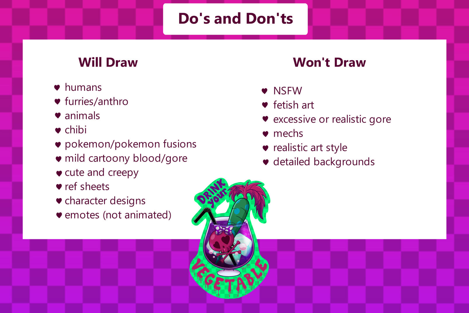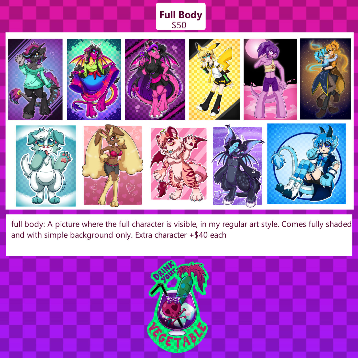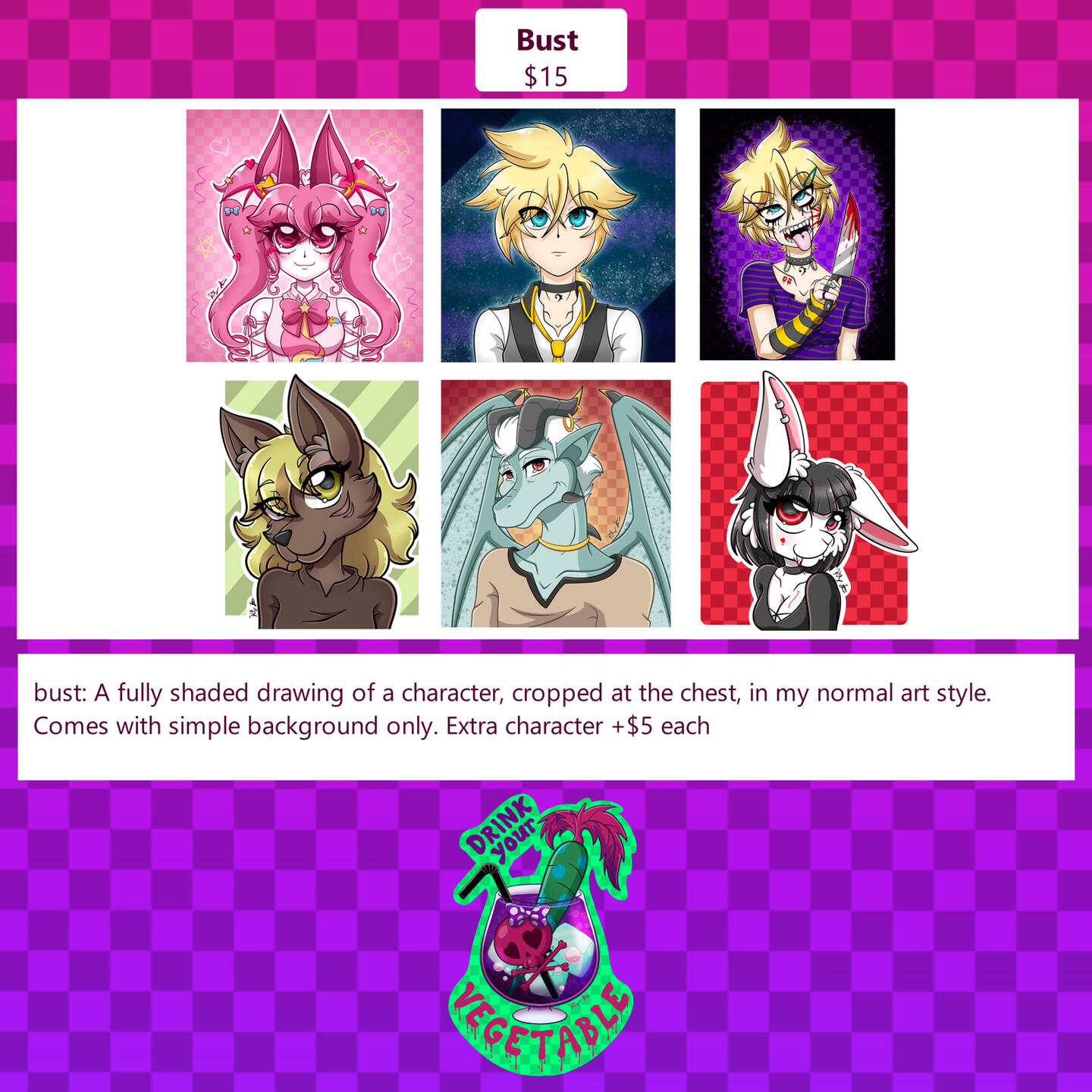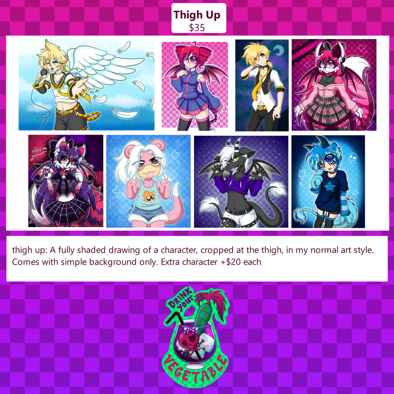 All drawings may or will include a signature that you may not removeI might record the drawing process and post it on my YouTube. I will also ask permission if I decide to use the art for this purpose.Prices are subject to change based on demandI have the right to reject any order that I do not feel comfortable drawing for any reason. Furthermore, I reserve the right to cancel and refund the commission at any time for any reason.I will not claim the intellectual property of the commissioned artwork, your original characters belong to youI will not disclose your personal information to anyone for any reason2. Payment